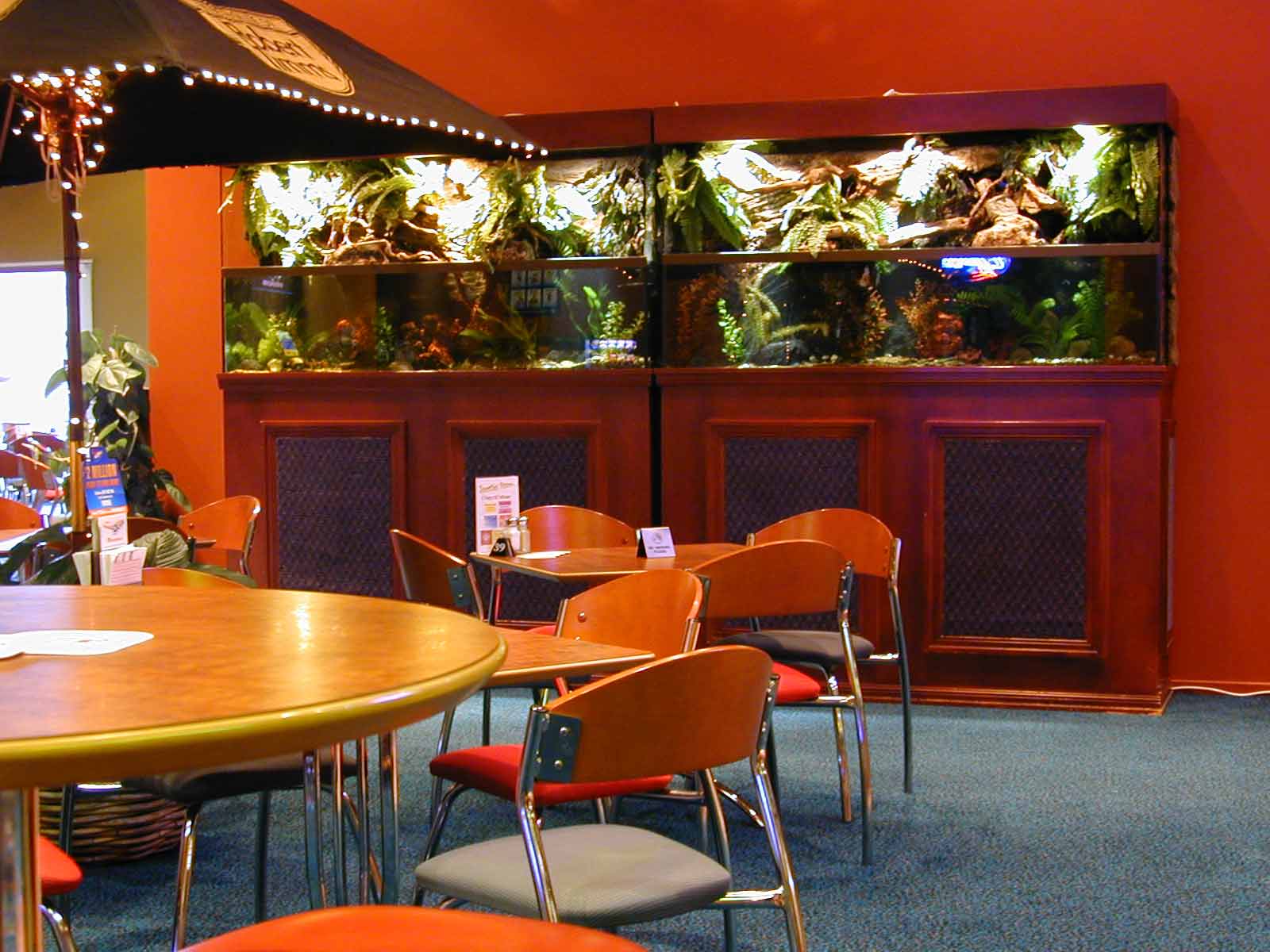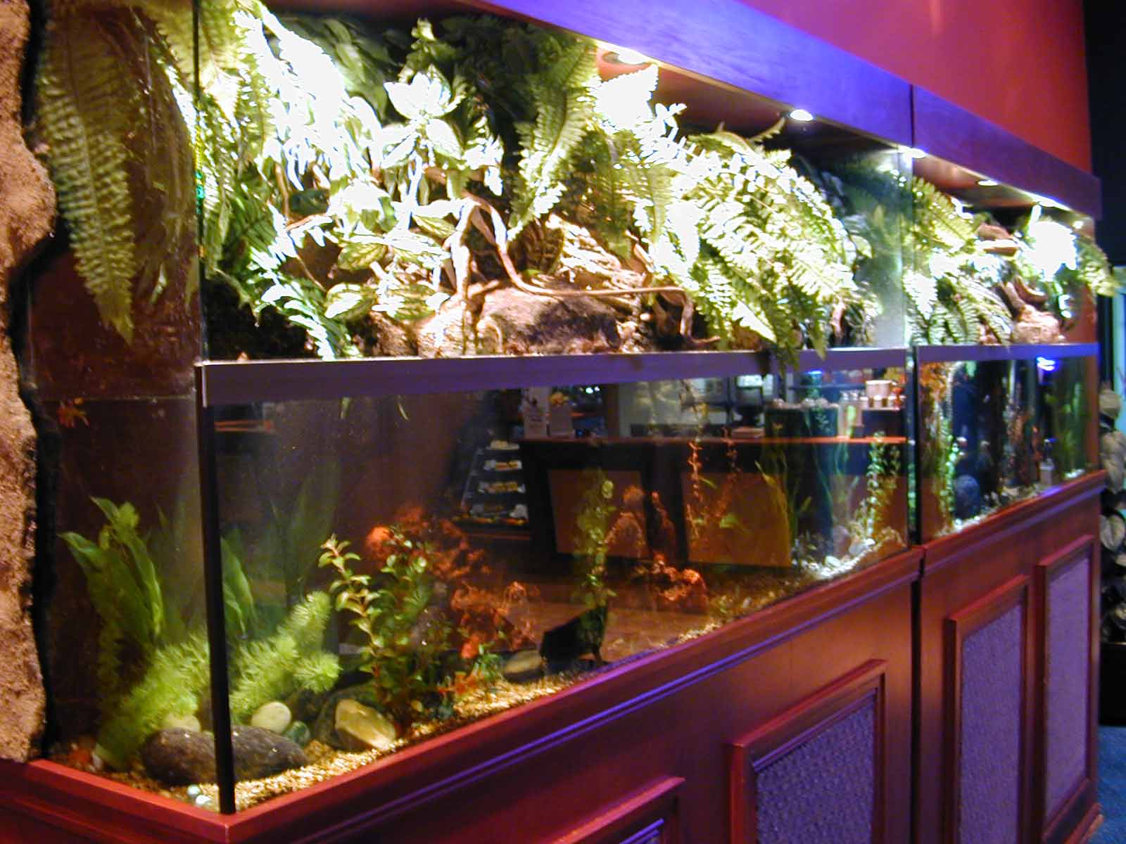 Filters are concealed within the background with no equipment visible . Aquarium installed 1998. |