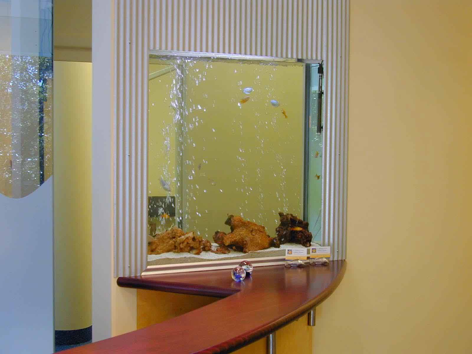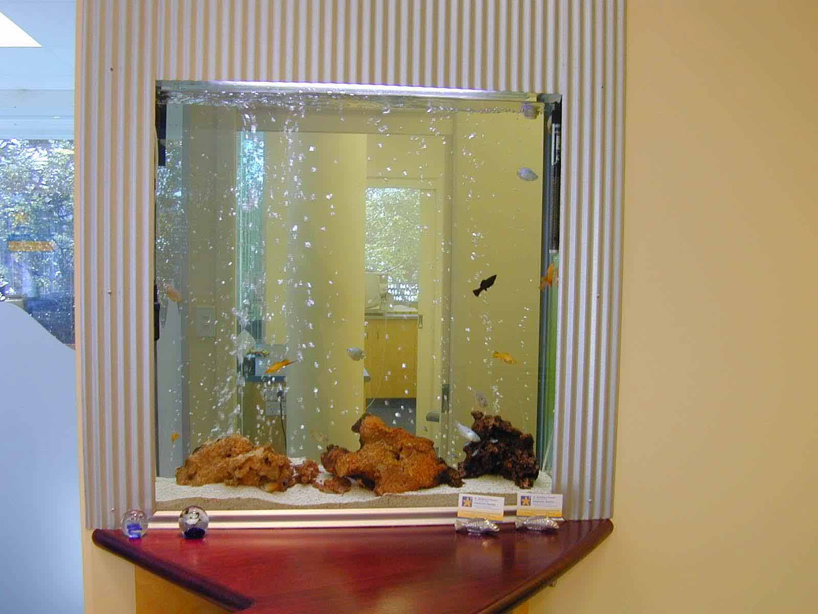 View through aquarium used as a wall divider in a children's dental clinic. Aquarium 880 mm (l) x 250 mm (w) x 900 mm (h) Dwarf Gouramies & Livebearers make up the majority fish species in this aquarium. Filtration contained in a cupboard beneath the aquarium with air pump located above the aquarium. Installed March 2001.
