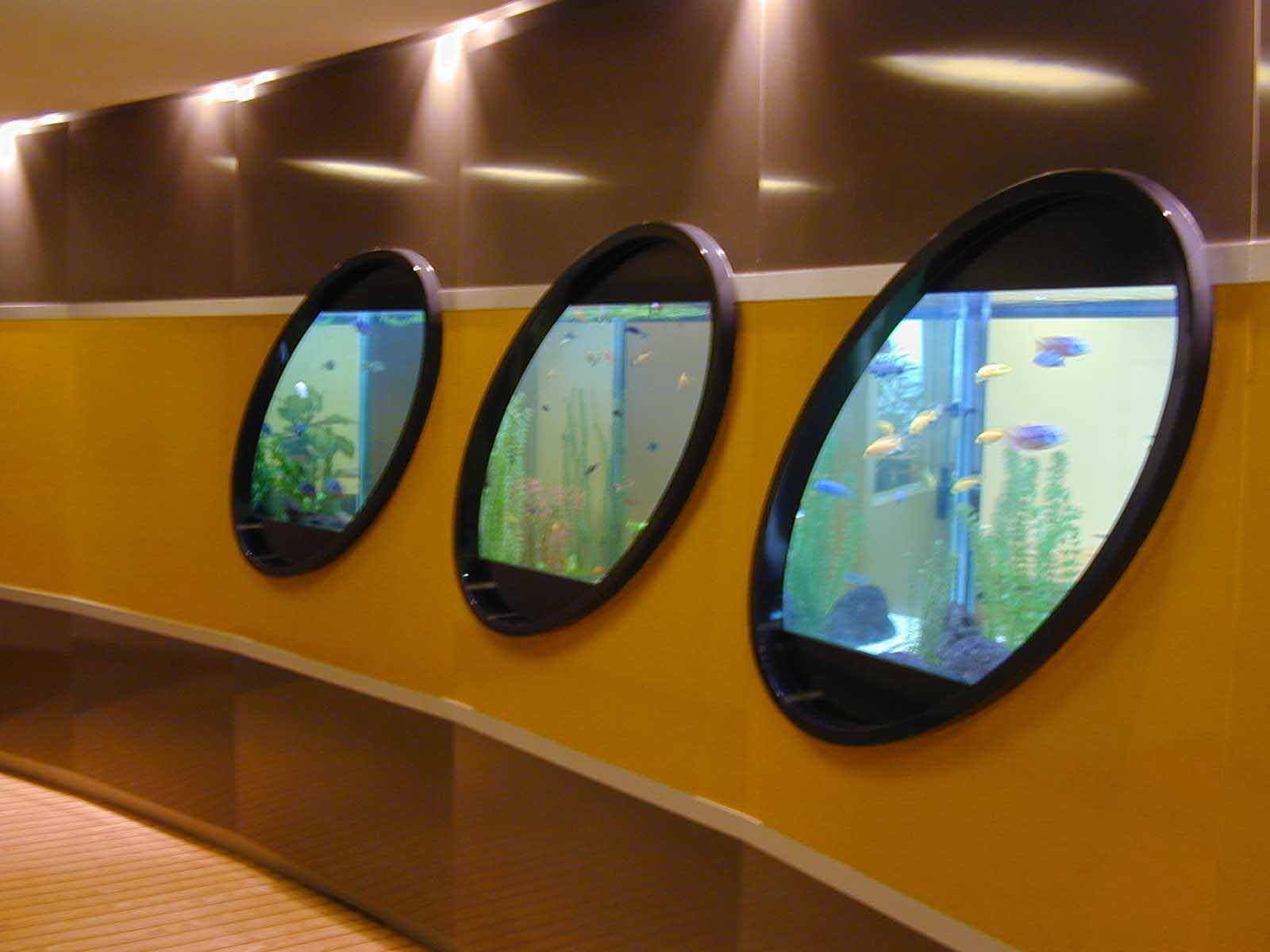Aquarium 1: Cichlids from Lake Malawi in Africa Aquarium 2: Gourami species and Cyprinids from South East Asia Aquarium 3: Cichlids from South and Central America |