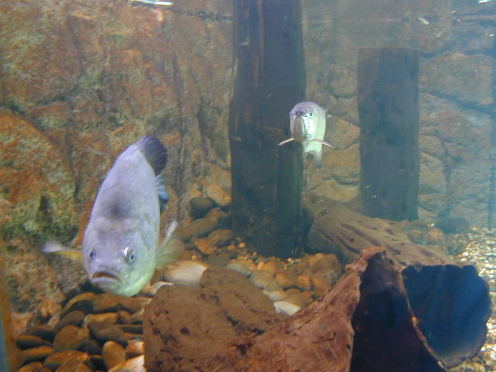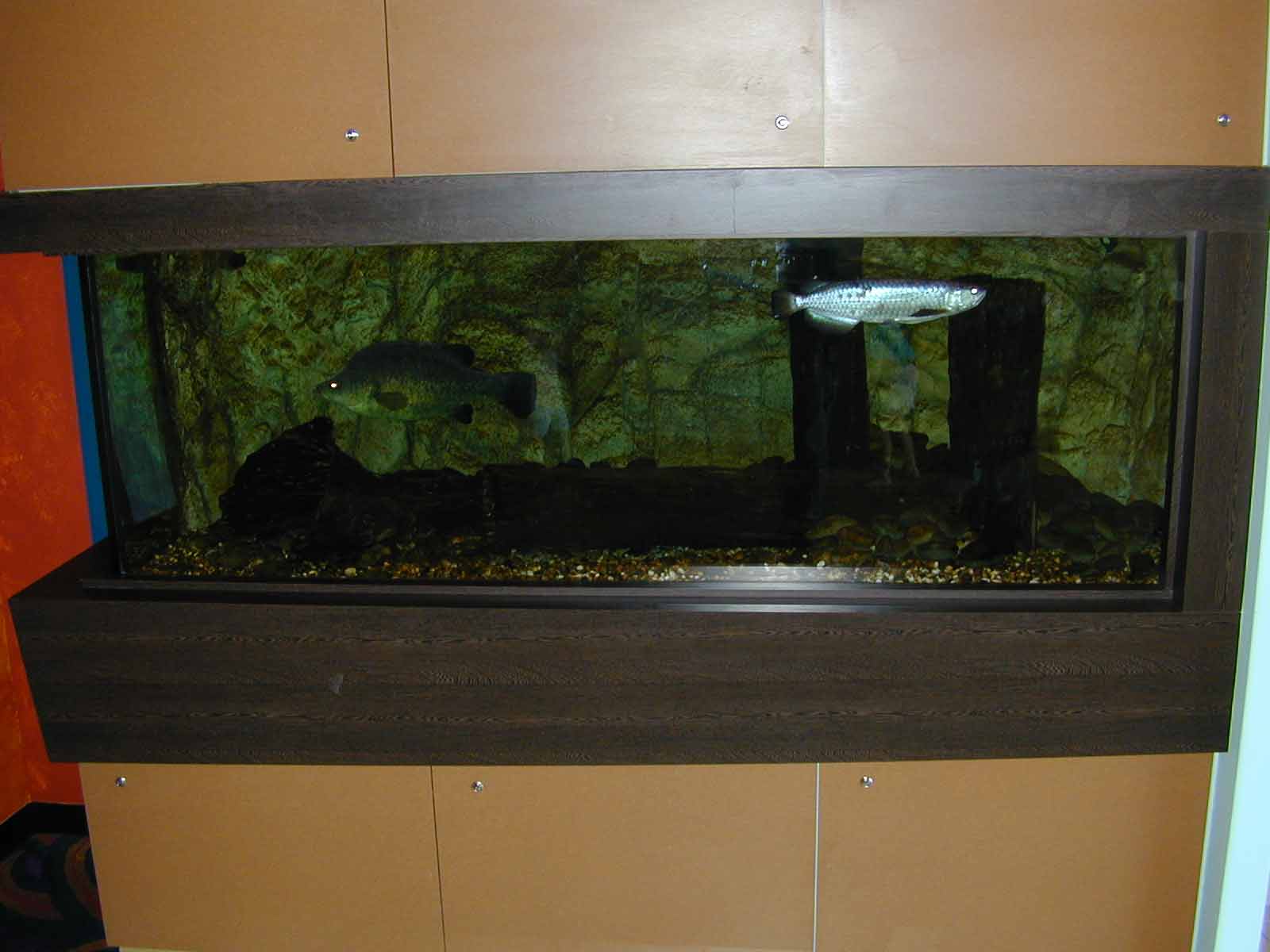 Aquarium for large Australian native fish in a natural looking creek bank setting. Aquarium dimensions - 2800 mm (l) x 1200 mm (w) x 750 mm (h) for a total volume of 2500 litres with large custom canister filter to handle large waste load produced by aquarium residents. Logs and rock background are all artificial moulded polyurethene. Fish maintained in this aquarium include Saratoga leichardti, Macquaria ambigua, Tandanus tandanus. |