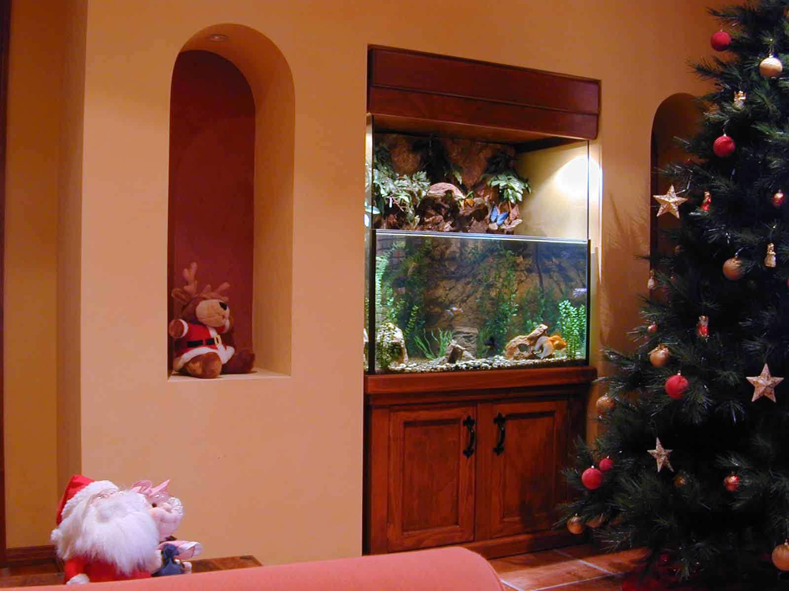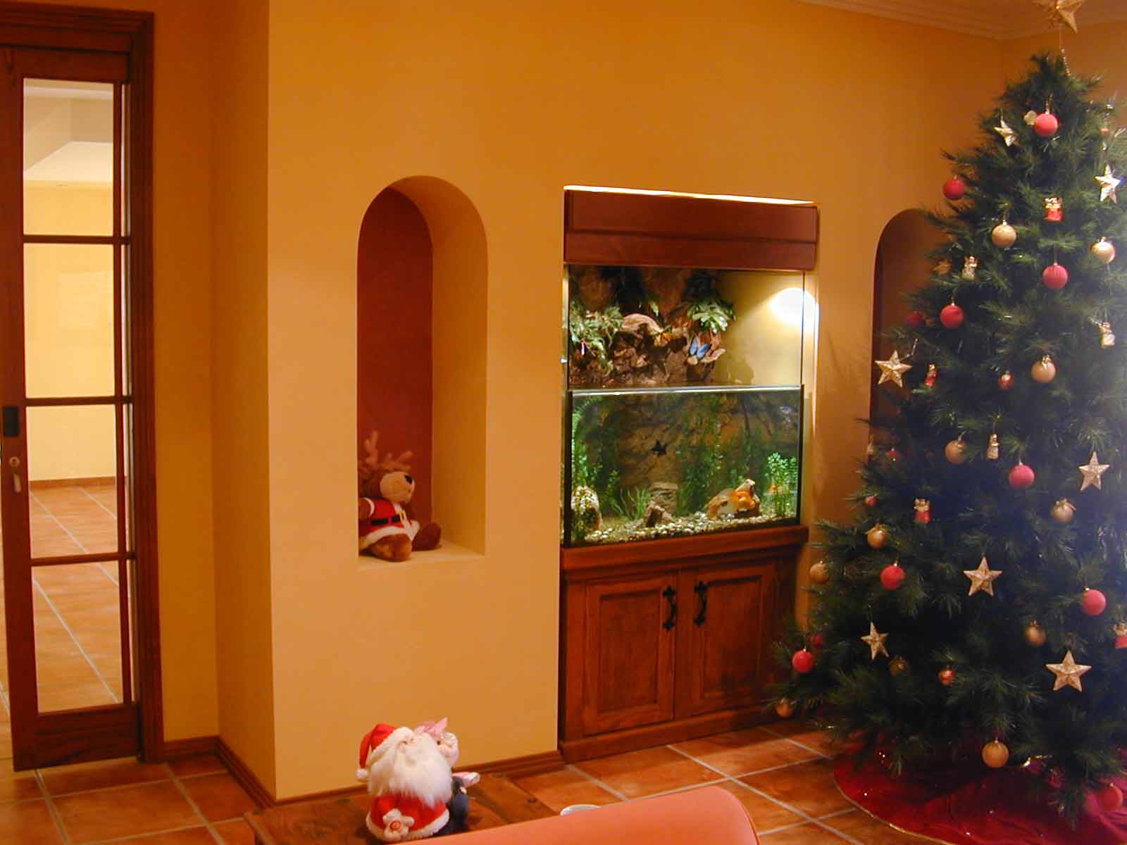 Aquarium 1060 mm (L) x 630 mm (W) x 550 mm (water height ) for a total water volume of 368 litres. Total aquarium height is 995 mm. High Backed Aquarium Custom built to fit in wall niche. Aquarium holds a selection of goldfish and has a waterfall which trickles down the artificial rock background. |